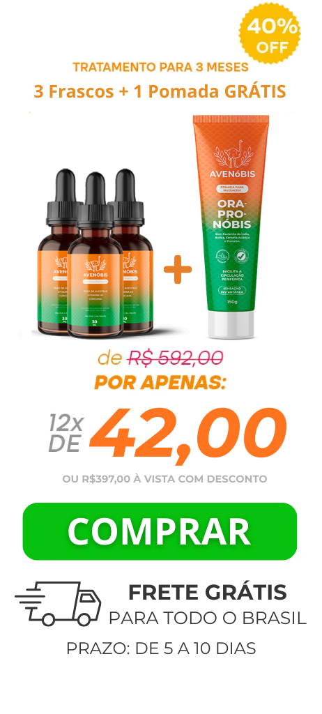 Tome 12 gotas pela manhã em jejum do Avenóbis Gotas, aplicando abaixo da língua para melhor absorção. Se quiser, pode aplicar numa colher e depois inserir na boca para maior facilidade e controle da dosagem. Para potencializar o resultado, aplique o Avenóbis Pomada nas regiões doloridas e massageie suavemente, duas vezes ao dia: de manhã e à noite antes de dormir. Não precisa exagerar na quantidade, pois ele espalha muito bem!